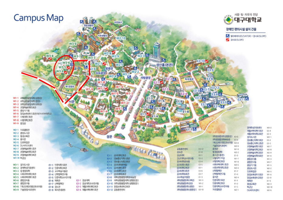 대구대학교 서문 입구 - (W3 - 4, 5, 6) 사회과학대학 종합강의동, 1호관, 2호관